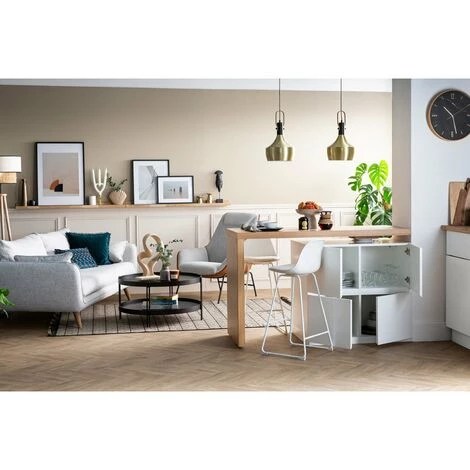 Cette table bar façon îlot central a été imaginée par Caroline Marliac, designer Miliboo. Elle a tout d’abord dessiné un beau plateau finition chêne de 140 cm de long et de 91 cm de haut. Rien n’a été laissé au hasard : sa petite hauteur lui permet de servir de plan de travail comme d’espace repas. Notre designer a ajouté un caisson de rangement blanc mat. Il est équipé de rangements ouverts et fermés pour ranger la vaisselle comme le nécessaire de cuisine.