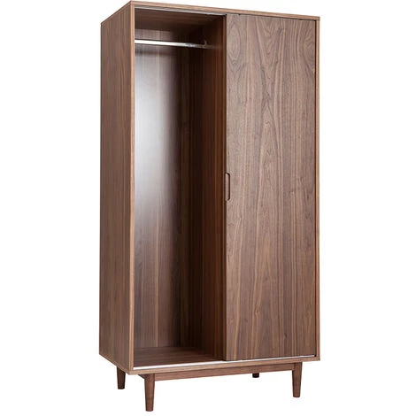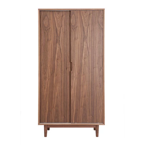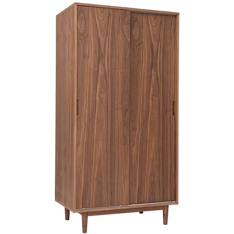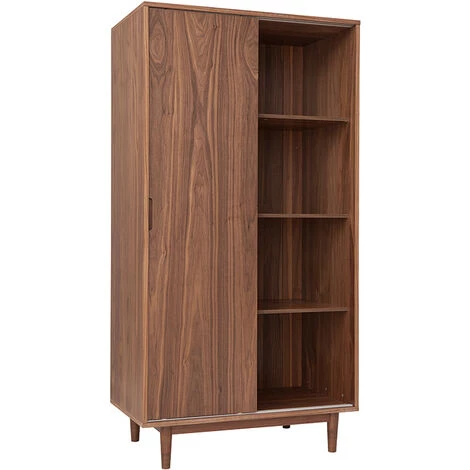 Une silhouette intemporelle à l’esprit pratique ! Véritable gain de place, les portes coulissantes – aux poignées minimalistes intégrées – renferment une penderie (L44.8 x P52.5 x H162 cm) et une étagère composée de quatre niches (L44.3 x P52.5 x H40 cm). Parfaite pour accueillir vos vestes, des vêtements, des boîtes à chaussures ou du linge de maison, la structure en panneaux de fibres de bois placage noyer et les quatre pieds en hévéa massif teinté noyer assurent robustesse et pérennité.