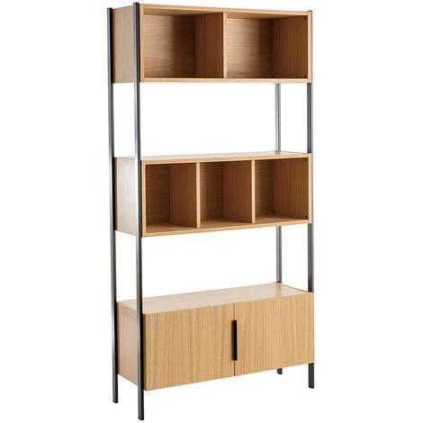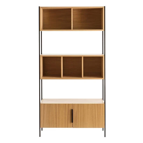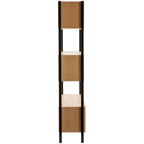Idéale dans un salon ou dans un grand bureau, cette bibliothèque (L98 x P35 x H195 cm) habille l’espace et lui donne une vraie personnalité. Son placage chêne et ses détails métalliques noirs en font une belle pièce de caractère qui rappelle subtilement le style industriel. Un meuble totalement dans l’air du temps qui saura ravir les mordus de déco !