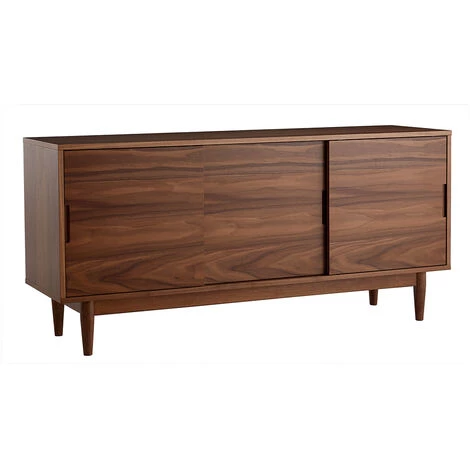 Indémodable et robuste, RYDD séduit par ses dimensions (L160 x P45 x H75) et spacieux rangements. Juché sur quatre pieds en chêne massif teinté noyer, le caisson en panneaux de fibres de bois placage noyer et finition intérieure noir mat renferme six niches fermées (L50.8 x P37.8 x H24.8 cm). Parfait pour accueillir du linge de maison ou de la petite épicerie, ce meuble pourra également faire office de vaisselier. Les poignées intégrées sculptées aux portes coulissantes, apportent une belle finition à l’ensemble.