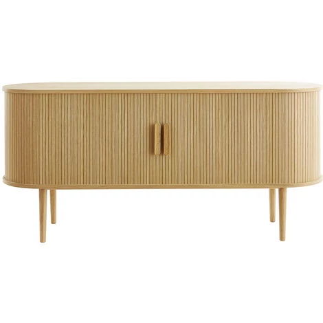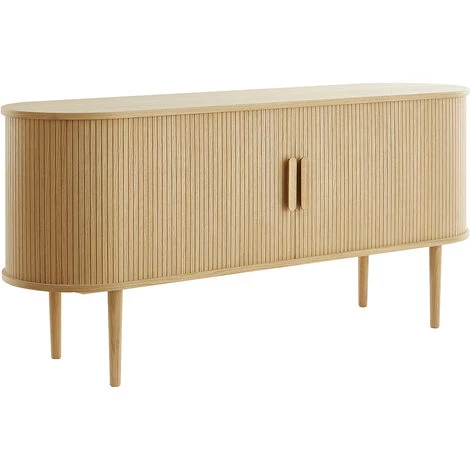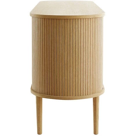 Ce qui le distingue ? Sa silhouette aux angles arrondis tout droit inspirée des années 70 ! Pour un look 100% vintage, il l’associe à de belles portes coulissantes et des pieds fuselés en chêne massif. En plus d’apporter du cachet à votre intérieur, ce buffet en bois clair saura insuffler une ambiance chaleureuse à souhait dans la pièce.