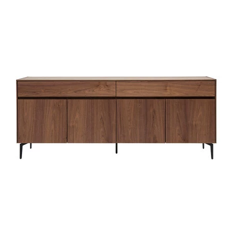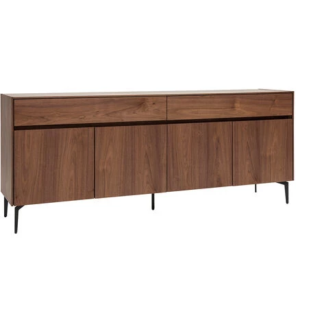 Ce buffet long associe une structure en panneaux de fibres de bois replaqués noyer à un piètement métallique ultra fin et moderne (H15 cm). Ses lignes nettes et essentielles apportent une vraie dimension contemporaine tandis que sa jolie finition noyer offre un rendu chaud et naturel. La laque transparente apposée sur la structure protège le bois sans modifier son aspect naturel. Très en vogue depuis plusieurs saisons, le noyer est une essence remarquable par ses douces nuances, ses multiples noeuds et ses veines marquées.