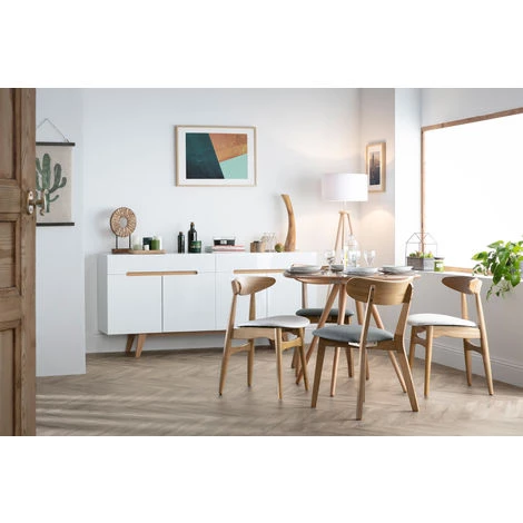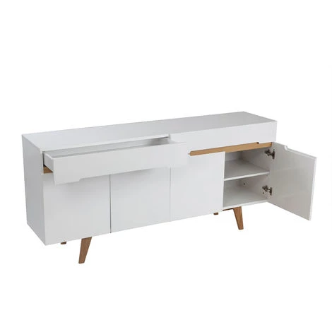 Alliance entre le blanc brillant et le frêne, ce buffet MELKA possède un esthétisme superbe. Il sera parfait dans un intérieur contemporain.