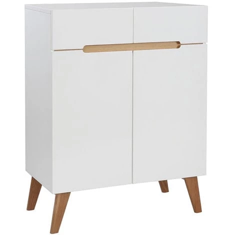 En panneaux de fibres de bois et frêne massif, ce buffet dispose de nombreux rangements malgré sa taille modeste idéale pour les petits espaces. Deux tiroirs équipés d’une fermeture soft sont positionnés au niveau supérieur du meuble. Deux niches sont disponibles sur la partie inférieure. Ces deux niches bénéficient chacune de 2 tablettes ayant une fonction d’étagère, celles-ci sont réglables en hauteur pour vous permettent d’adapter vos rangements à votre vaisselle.