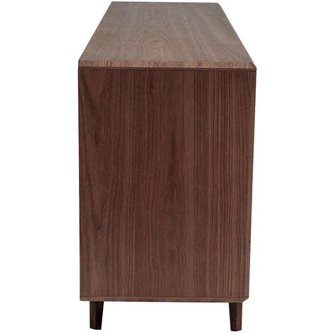 Si les formes généreuses (L160.3 x P42 x H75.5 cm) de ce meuble attirent les regards et habillent une pièce, ce buffet séduit tout autant par sa grande contenance ! Minimalistes, les portes sans poignées dissimulent deux espaces de rangement divisés par une tablette. Avec ses quatre spacieux compartiments (L77 x P36.6 x H27.5 cm), parfaits pour accueillir linge de table, vaisselles, provisions… SUVA sera le compagnon idéal d’une cuisine ou d’un salon bien organisé ! Résolument robuste, il est composé de panneaux de fibres de bois placage noyer et de quatre pieds au design soigné en hévéa massif teinté noyer.