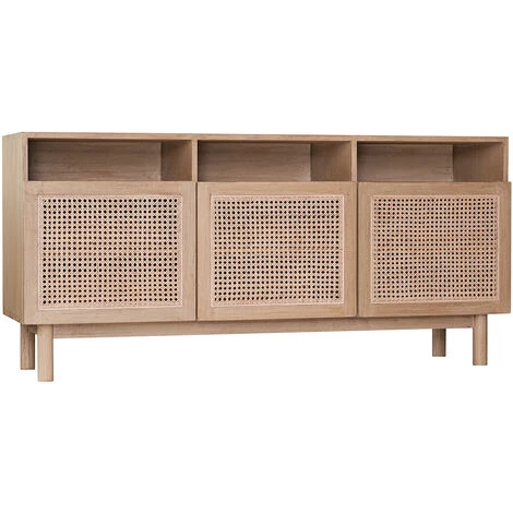 Maîtrisant avec brio lignes épurées et volumes à l’inspiration vintage, GALINA fait la part belle au naturel ! Tandis que l’essence de bois exotique aux doux reflets blonds habille la structure, les portes se parent d’un joli motif canné, résultat des plus authentique garanti ! Ce buffet, empreint de charme, prendra avec aisance ses marques dans une cuisine, salon ou chambre aux tendances ethnique, bohème ou rétro.