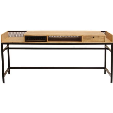 Le design de ce bureau aux dimensions généreuses a été spécialement pensé pour apporter rangement et confort de travail. La partie supérieure du plateau d’une largeur de 80 cm est idéale pour installer son ordinateur, grâce au passe-câble intégré, tout en profitant d’une grande surface pour travailler. Les deux compartiments ouverts, de part et d’autre, ont été conçus pour accueillir dossiers et classeurs. Pour une meilleure organisation et un bureau toujours bien rangé, deux tiroirs et une niche complètent l’ensemble. Afin de profiter d’un confort de travail optimal, associez ce bureau en bois massif à un fauteuil à roulettes tendance.