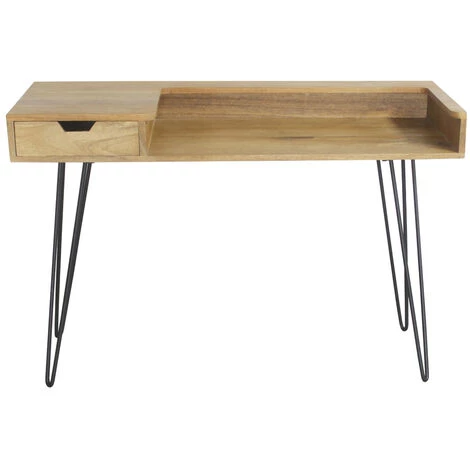 Du plateau en manguier aux pieds en épingle, tout a été pensé pour faire de ce bureau une pièce au style indémodable. Le manguier, ce bois exotique au grain si particulier, est un matériau chaleureux qui donne au mobilier un charme certain. Le bureau VIBES associe ce beau bois à un piètement métallique design. Si la teinte noire de ce dernier met en valeur le plateau, sa forme en épingle apporte une touche de légèreté et de vintage à l’ensemble pour un rendu original et déco.
