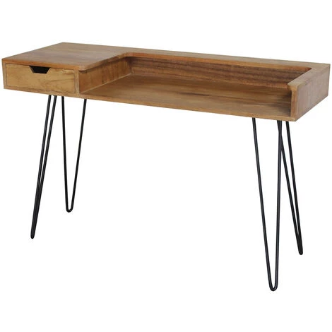 Si l’esthétique de ce bureau en bois massif a été particulièrement soignée, l’aspect pratique n’a pas été oublié. Le plateau, découpé en deux niveaux, offre une belle surface de travail compartimentée. Afin de pouvoir ranger et garder à portée de main les indispensables, le bureau design VIBES comprend également un tiroir. Ce meuble peut compléter un bureau industriel ou une pièce de vie ethnique chic. Le bois de manguier réchauffera la pièce et se mariera facilement avec la décoration existante. Pour un maximum de confort et de style, accompagnez-le du fauteuil de bureau design bois et noir WALNUT.