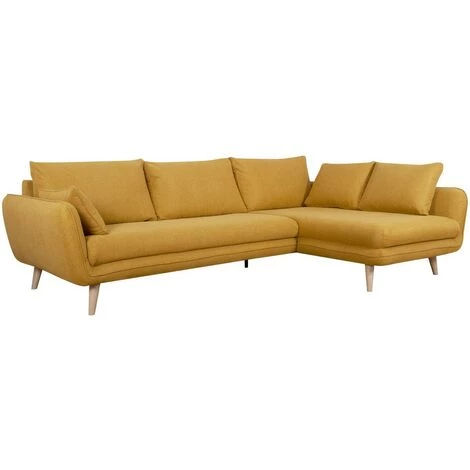 Ce canapé d’angle est une assise aussi pratique que jolie. Son revêtement en polyester jaune cumin en fait un siège dans l’air du temps. Il est accompagné d’un piètement compas en hêtre massif, un bois clair et chaleureux. Sa forme épurée, ses lignes courbes et ses matériaux rappellent tout ce qui fait le charme du style nordique. Pour un salon 100 % scandinave, on complète ce canapé d’angle avec des tables gigognes en bois.