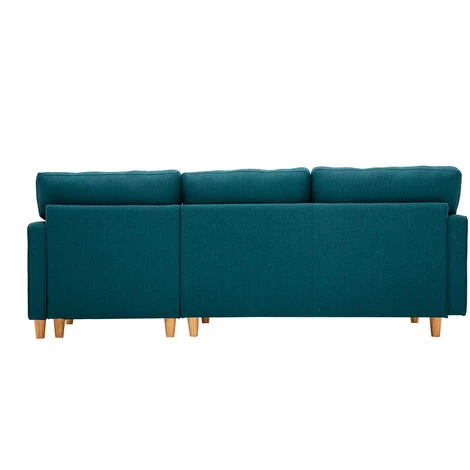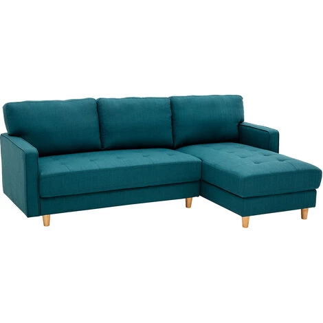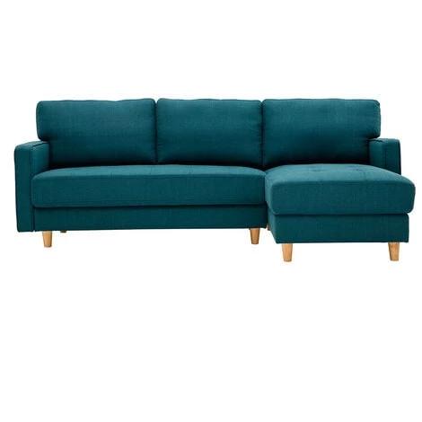 Avec sa silhouette moderne et son assise capitonnée, le canapé d’angle CUMBIA mélange les styles avec brio. Esprit classique et ligne contemporaine se côtoient pour un résultat au charme unique. Revêtu d’un magnifique tissu 100 % polyester bleu canard et équipé d’un solide piètement en bois massif, ce canapé est un intemporel, facile à marier à différents styles déco.