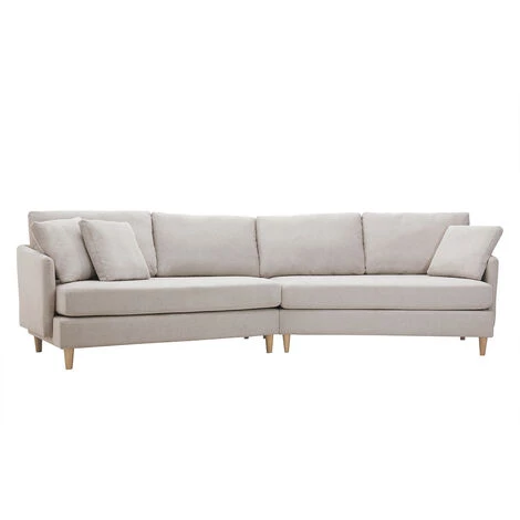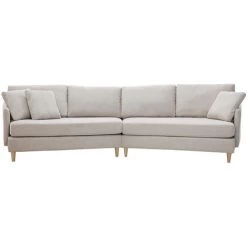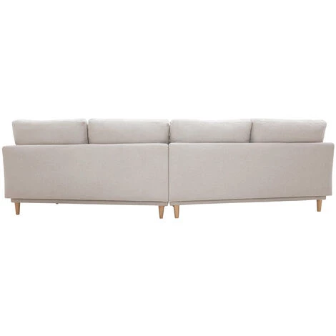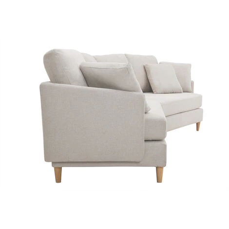 Revêtement en tissu effet velours texturé beige, piétement en hévéa massif et silhouette épurée forment le trio parfait. Doux et harmonieux, ce canapé d’angle saura donner le ton d’un salon où il fait bon vivre. Accompagnez le d’un pouf effet laine bouclée et d’un tapis duveteux et adoptez l’esprit cocooning !