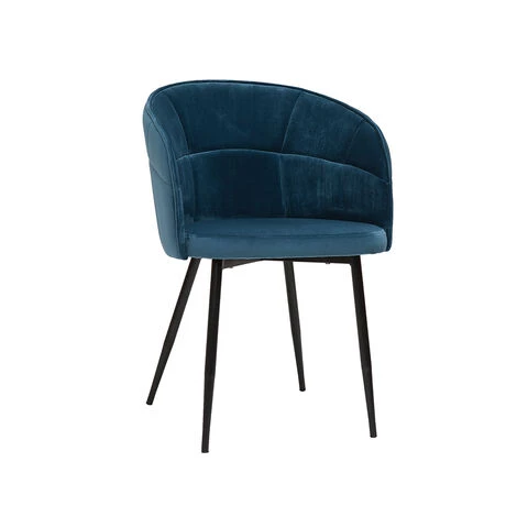Miroitant et agréable au toucher, le tissu velours habille avec délicatesse le siège tout en rondeur. Cette matière chaleureuse est dynamisée par un intense et tendance coloris bleu pétrole. Le piètement fuselé en métal noir modernise l’ensemble pour un résultat des plus glamour !