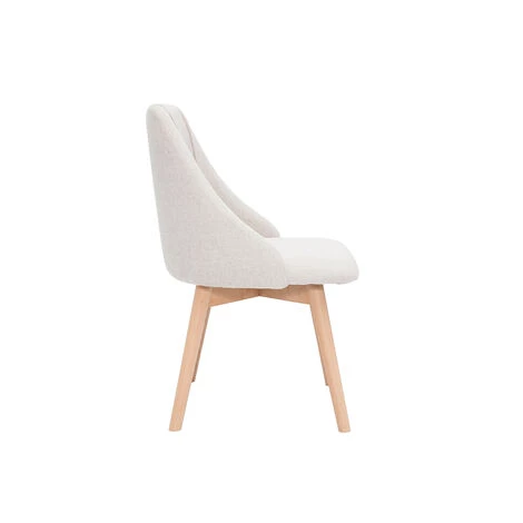 Ces chaises légères et polyvalentes allient confort et convivialité. Avec leur dossier enveloppant (H40 cm) et leur assise généreusement rembourrée, elles jouent la carte de la douceur. Les formes douces répondent aux teintes naturelles dans un équilibre parfait et une élégance subtilement décontractée. Leur tissu beige invite à la quiétude et s’accorde parfaitement avec le piètement en hêtre massif. Détail de style : les deux surpiqûres situées à l’intérieur du dossier souligne la ligne graphique sobre et affirmée de ces chaises.