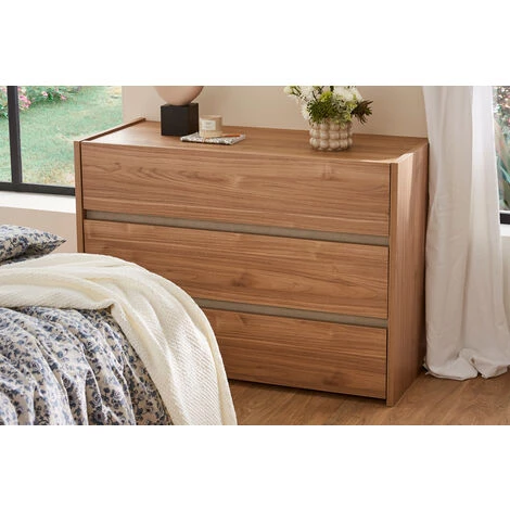 La commode ODE est un meuble fonctionnel. Elle est équipée de trois grands tiroirs (L102.4 x P38.8 x H14 cm) afin de ranger facilement linges de maison et vêtements. Disposé dans une grande ou une petite chambre, ce meuble peu encombrant (L111 x P50 x H79 cm) est un allié de taille pour garder son intérieur organisé. Pour personnaliser votre intérieur, profitez de son plateau pour y installer différents éléments décoratifs.