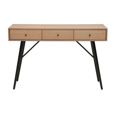 Avec ses dimensions (L120 x P35 x H81.5 cm), cette console n’encombrera pas l’espace, on l’imagine même habiller un couloir étroit ! Dans une pièce de vie, ce meuble au solide piètement en métal pourra également faire office de bureau d’appoint.