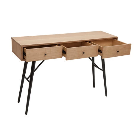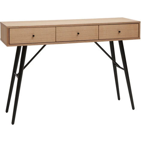 Inspirée des consoles vintage et modernisée par des lignes contemporaines, cette console sublimera votre hall et donnera le ton de votre déco intérieure. Son caisson en bois (panneaux de fibres de bois placage frêne) et son piètement en métal noir forme un harmonieux duo. Une combinaison gagnante de matières et couleurs pour un look 100 % contemporain !