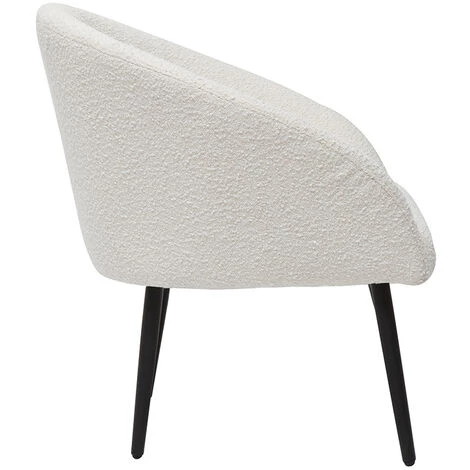 Signature d’un design empreint de douceur, le siège tout en rondeur, campe sur un aérien piètement noir et s’habille d’un tissu blanc effet laine bouclée (100% polyester). Ce textile cosy et fluffy au tissage irrégulier a connu son heure de gloire dans les années 70 et revient en force sur le devant de la scène déco – prêt à réchauffer vos intérieurs en moins de temps qu’il n’en faut pour le dire ! Pratique, son gabarit L79 x P69.5 x H78.5 cm lui permet d’aménager des petits espaces : élément déco dans une chambre à coucher ou une entrée, propice à la détente dans un bureau, siège d’appoint dans un salon, la silhouette à la fois chic et moderne du modèle OLIVIA habillera d’élégance de nombreuses pièces de vie au style contemporain.