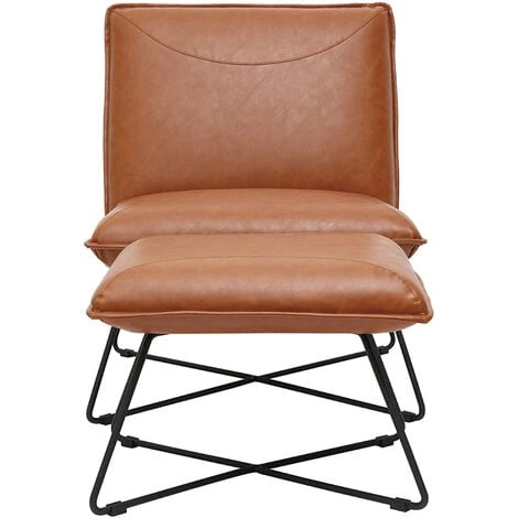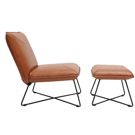 Revêtu de polyuréthane marron, le fauteuil et son repose pied PHILO apporteront chaleur et personnalité à votre intérieur. Son piètement métallique fin en étoile lui assure une bonne stabilité et souligne les lignes fines de cette pièce de mobilier.