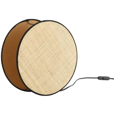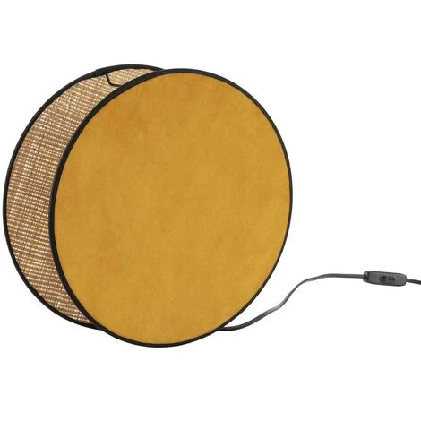 Cette lampe mélange avec habileté les matières. Le premier disque est habillé d’un élégant tissu velours jaune moutarde tandis que le second est recouvert d’un tissu rabane 100% naturel. Ces disques encadrent la source lumineuse qui est maintenue par une fine structure en fil d’acier noir. Ils diffusent une lumière tamisée et chaleureuse. L’effet lumineux change selon le positionnement de la lampe.