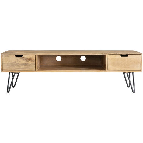 Muni de deux tiroirs latéraux, il est aussi pratique que design grâce à sa niche ouverte et son passe-câbles : idéal pour y ranger les objets du quotidien, son décodeur et autres câbles.