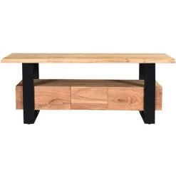Le meuble TV WAYI est une pièce réalisée artisanalement avec des matériaux de qualité. L’acacia et le métal ont été travaillés à la main pour un rendu unique. On retrouve dans ce meuble TV tout le caractère des meubles artisanaux. Un épais piètement métallique soutient un sublime plateau aux contours irréguliers et un ensemble de rangements en bois massif. Les tons rougeoyants de l’acacia contrastent à merveille avec le métal noir. Composé de matériaux aussi beaux que solides, le modèle WAYI apporte à l’espace salon un charme naturel.