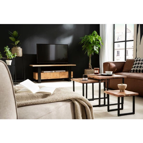 Avec ses trois tiroirs et sa niche centrale, le meuble TV WAYI accueille aussi bien les appareils électroniques que les affaires du salon. Pièce robuste, il peut parfaitement soutenir un bel écran télé. Pour une déco de caractère, on l’accompagne d’un tapis berbère et d’une table basse dans la même essence de bois.