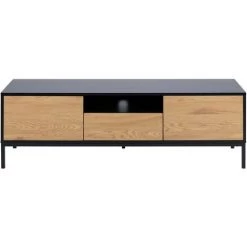 Si la structure en panneaux de fibres de bois noirs et le piètement en métal assorti évoquent l’esprit indus’, leur aspect lissé et leur légèreté apportent de l’élégance à cette tendance déco brute. Le piètement fin donne de la hauteur au modèle TRESCA pour un espace TV qui n’allourdira pas votre séjour. Les portes en panneaux de fibres de bois décor chêne créent un joli contraste avec cette structure métallique. Elles ajoutent la touche chaleureuse et authentique qui fait tout le charme de ce meuble.
