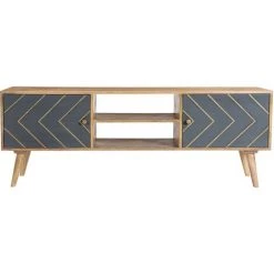 Alliant authenticité et modernité, ce meuble TV en manguier massif affiche un look unique. Si sa matière naturelle réchauffe incontestablement l’atmosphère, ses portes grises aux motifs graphiques en incrustation laiton apportent une véritable touche contemporaine à l’ensemble. Pour parfaire son style, ses poignées sont en métal couleur gold. Le piètement compas apporte la touche finale à son allure terriblement tendance !