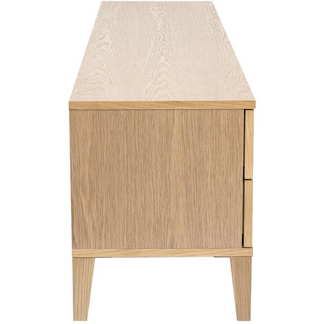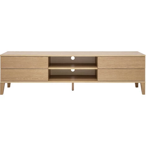 Inspiré du mobilier en bois scandinave, ce grand meuble TV (L180 x P40 x H50 cm) s’intègre en douceur dans nos intérieurs. Son esthétique minimaliste met l’accent sur la fonctionnalité. Il est doté de 2 niches ouvertes avec passe-câbles qui accueilleront vos différents appareils électroniques (box, lecteur DVD ou console) sans risque de surchauffe et 4 grands tiroirs (dimensions intérieures : L51.5 x P28.5 x H10.5 cm) parfaits pour dissimuler tous les accessoires qui s’accumulent au fil du temps.