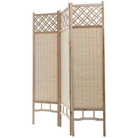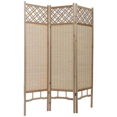 La structure de ce paravent est en bois de sapin, finitions bois naturel et l’intérieur des panneaux est en lattes de bambou.