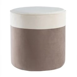 Ce pouf au look couture se distingue par son magnifique revêtement, un tissu bicolore taupe et blanc crème dont le velouté sollicite l’oeil autant que la main.