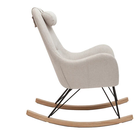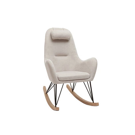 Ultra tendance, le fauteuil à bascule fait son grand retour sur le devant de la scène déco. Laissez-vous bercer par ses doux mouvements et adoptez le rythme du « slow life ». Ce rocking-chair au design rétro scandinave présente une silhouette tout en courbes. Des volumes teintés de naturel grâce au revêtement en tissu beige et pieds en bois clair, que seuls les renforts en métal noir viennent moderniser.