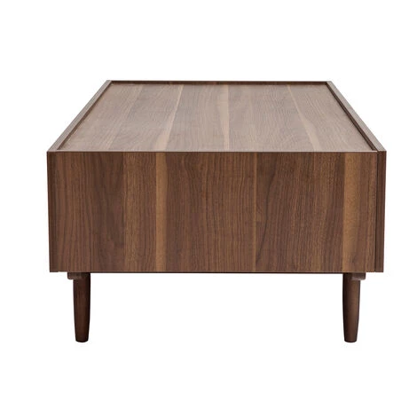 Entre épure contemporaine et lignes rétro, cette table basse séduit par ses volumes équilibrés et ses jolies nuances brunes. Son élégante finition noyer au veinage contrasté définit les contours d’une atmosphère chaleureuse et feutrée. Le grand plateau est soutenu par quatre pieds arrondis en hévéa massif teinté noyer au look délicieusement fifties.