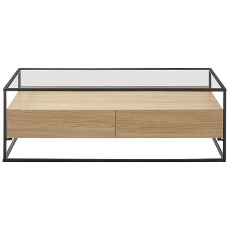La finesse de la structure en métal associée à la transparence du magnifique plateau en verre trempé posé dessus donne à cet ensemble un style léger et aérien. Comme semblant flotter au-dessus du sol, deux tiroirs décor chêne complètent le tout. La table basse FINN joue avec la transparence pour offrir un rendu élégant et unique.