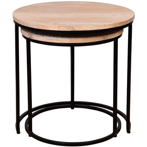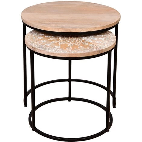 Conçues avec des techniques artisanales, elles disposent de belles finitions et d’un rendu « fait-main » qui fait tout leur charme. La plus petite table possède des motifs peints en blanc qui se démarquent du plateau en manguier. Le piètement en métal en demi-cercle vient trancher avec la douceur du bois clair et des motifs.