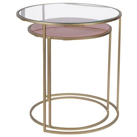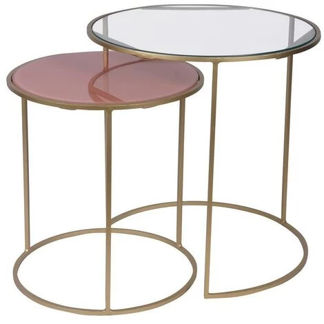 Fabriquées à partir de métal doré, les structures aériennes dessinent des lignes graphiques dans l’espace. Elles s’équilibrent parfaitement avec les plateaux en verre fins et délicats. Le plateau de la grande table basse est en verre transparent tandis que le plateau de la petite présente une jolie teinte rose tendre.